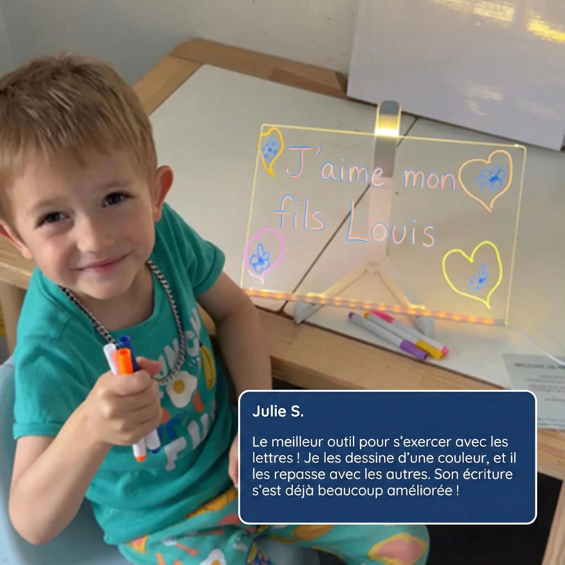 Pas d’apps, pas de distractions, pas de limites. Juste un tableau réutilisable, des couleurs vibrantes et une imagination qui explose. Ton enfant peut dessiner, effacer et recommencer autant de fois qu’il veut, sans peur de se tromper. Cette liberté booste sa concentration, son autonomie et sa capacité à s’exprimer, tout en réduisant naturellement l’envie d’écran.